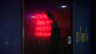 Woon’s camera is pointed at unconventional places and objects, and sometimes through glass, whose reflections add a shimmering layer of complexity to the scene. The resulting images—a bus about to herd off tired workers; a shattered glass on a stairwell door; a bar hostess racing up a staircase, her white stiletto balanced precariously—can feel, to anybody who’s visited Singaporean malls at night, more like fragments of one’s memory than something new. Did Woon actually photograph something for us? Or did he just help us reach into our past?