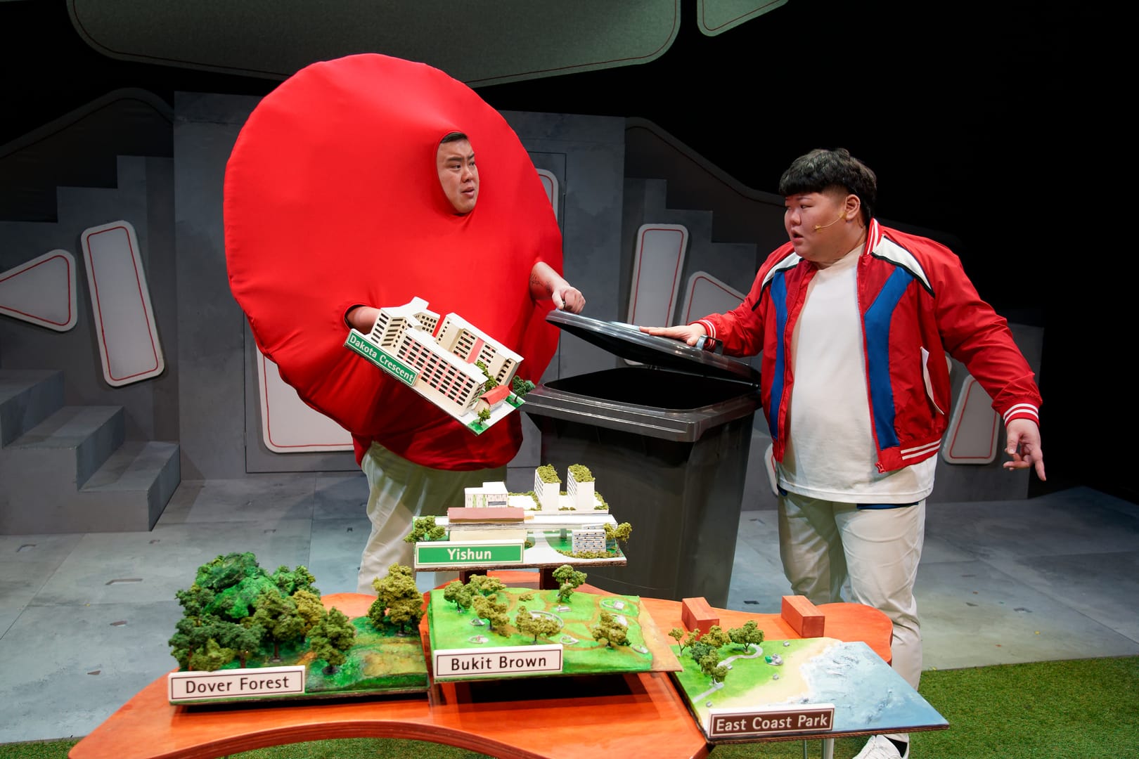 The show embarks on a wide-ranging survey of marginal histories and invisible communities; a deep dive isn’t possible here, but that isn’t the point. The punchlines come thick and fast, as do the potted histories. We get the 1960s Nantah student protests in a few minutes, and miniature dioramas of Bukit Brown Cemetery and Dover Forest are quickly shelved in a Mari Kondo-esque decluttering exercise. Lim leans into how the NDP has leveraged pageantry and spectacle as an “effective means of social control”, according to geographers Lily Kong and Brenda Yeoh. The parade’s hyper-endorsement of a particular set of shared values then enforces a particular kind of group cohesion. In their analysis of three decades of the NDP, Kong and Yeoh argue that if “the values that rituals reveal and emphasise are shared values,” then “collective participation in ritual suggests affirmation of those values being celebrated.” As the audience of “National Day Charade”, we’re partaking in a brand new ritual and affirming an entirely different set of values. It’s a clever way to exploit our patriotic socialisation and turn it on its head: same emotional manipulation, different socio-political outcomes.