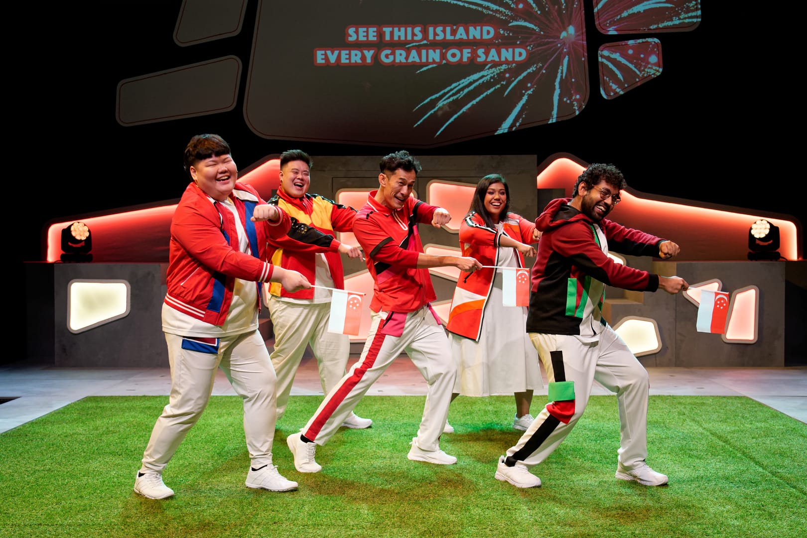 Lim knows how to get to you, too. He’s crafted a Saturday Night Live sketch comedy equivalent of the National Day Parade (NDP), and there’s no immunity from its infectiously likeable cast—Andrew Marko, Deonn Yang, Krish Natarajan, Nurulhuda Hassan and Shane Mardjuki—working the crowd furiously in every scene. We’ve got audience participation, musical improvisation, funpack giveaways, bite-sized scenes that mix side-eye humour and hard-hitting histories, and, to cap off the evening, a full-blown karaoke session of National Day songs. Even the most resistant audience members might find this brand of emotional manipulation hard to hold out against.