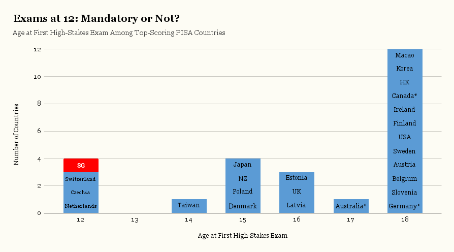 Singaporean students take the PSLE at age 12. The PSLE is a high-stakes exam, which does more than measure students’ progress—it has a material impact on their future. Such an exam at such a young age is unusual among high-performing systems. Many delay high-stakes selection until age 15 or later, and some until the end of secondary education.