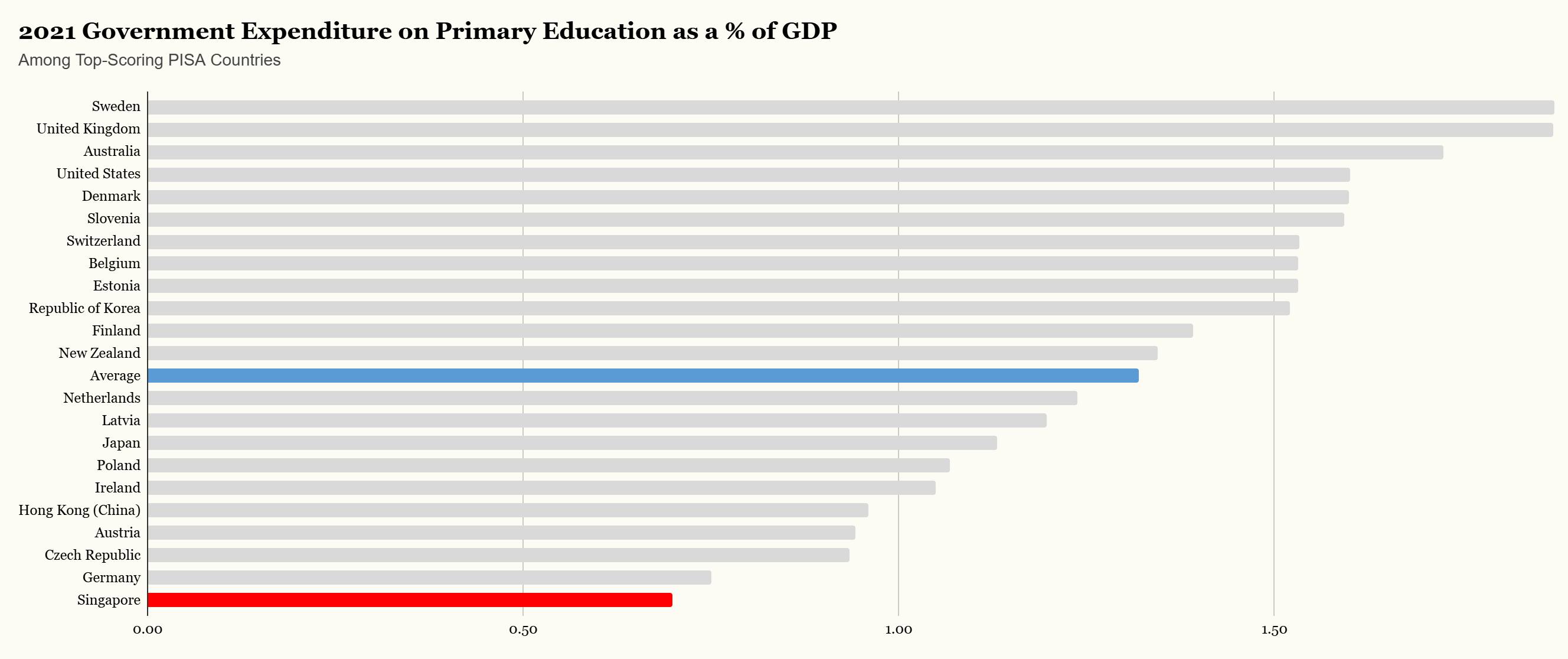 However, Singapore is once again an outlier when it comes to spending on primary education as a percentage of GDP. Singapore’s reported government expenditure on primary education was approximately S$2.9bn in 2021, though cross-country comparisons are sensitive to differences in in how countries classify and report education expenditure.
