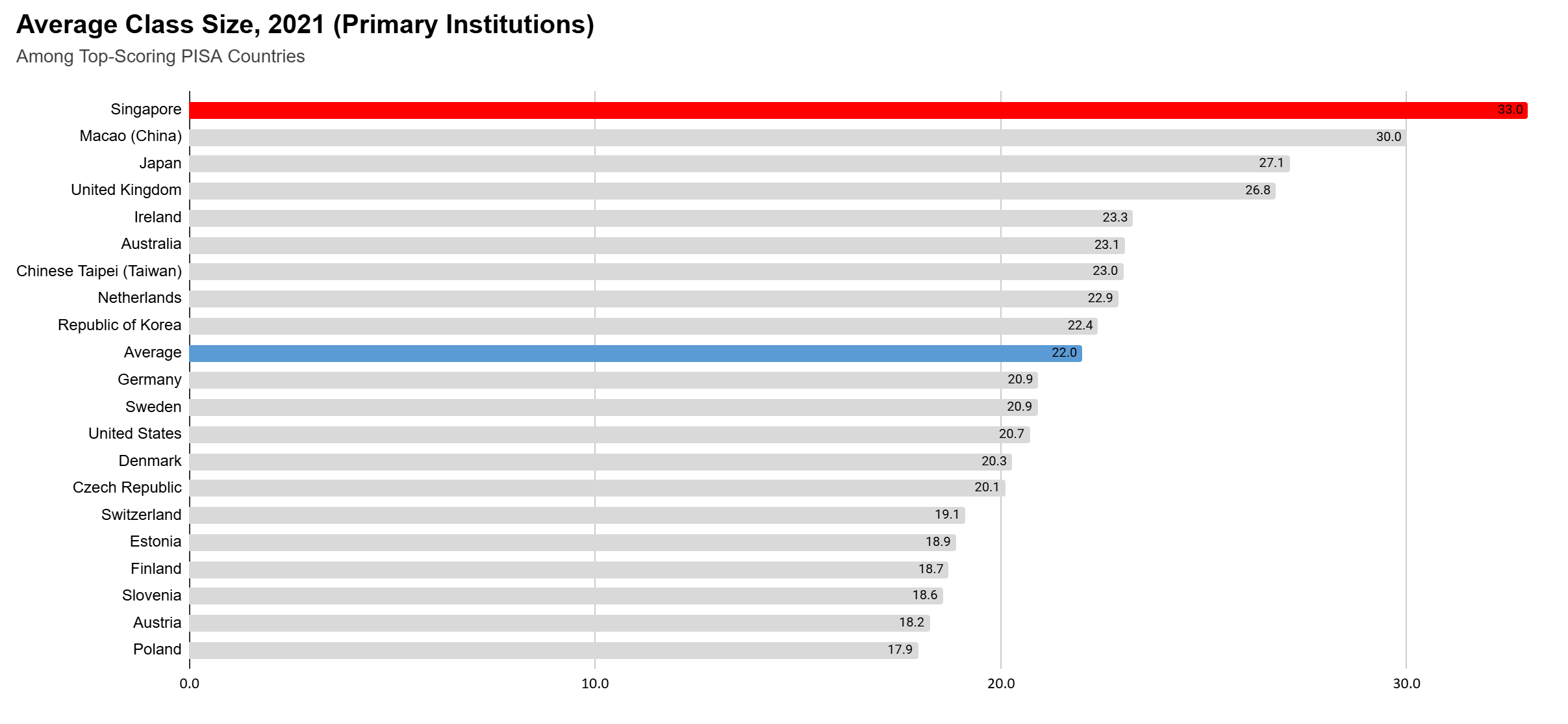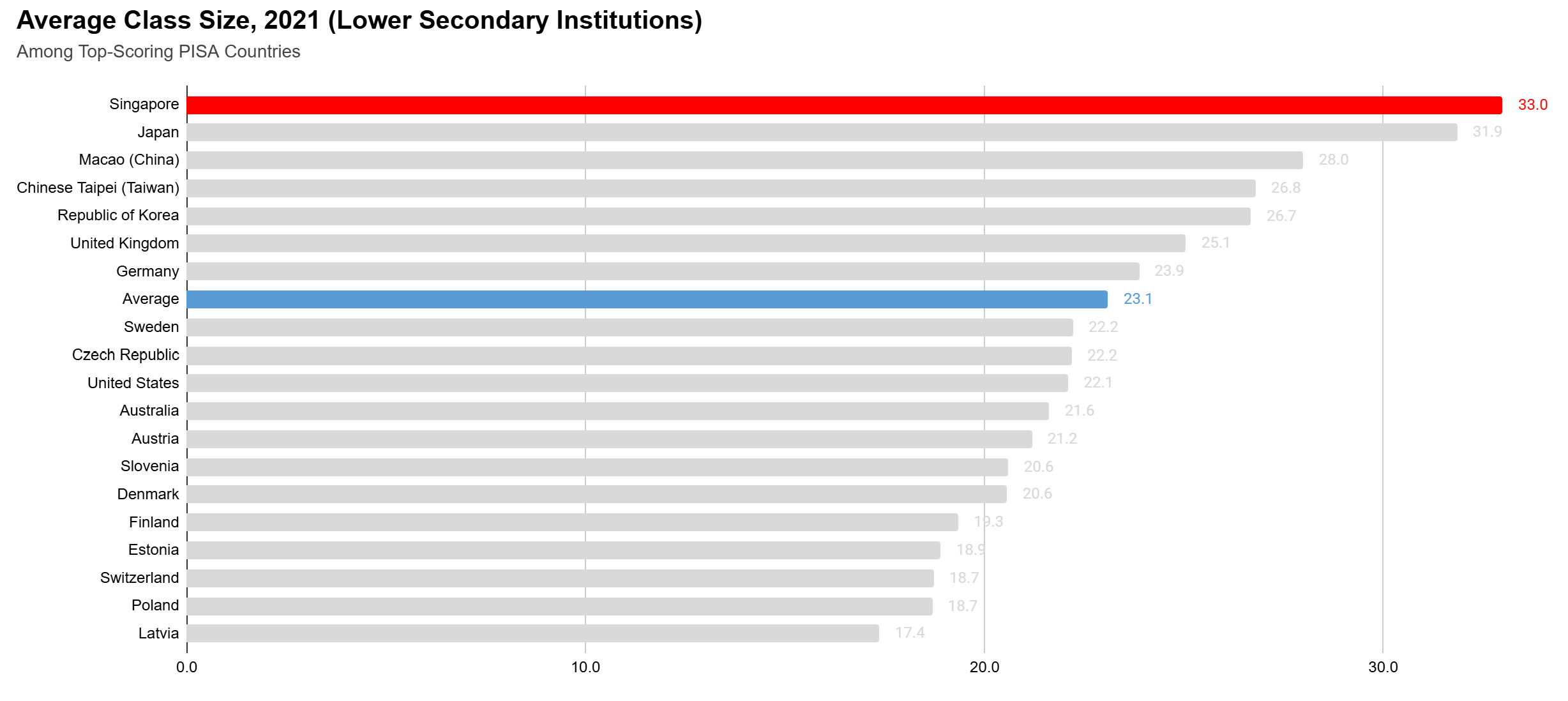 The gap between the Singapore average and the norm in top-performing PISA countries only widens in secondary school, with 33 students per class against an international average of 23.1 in lower secondary institutions.