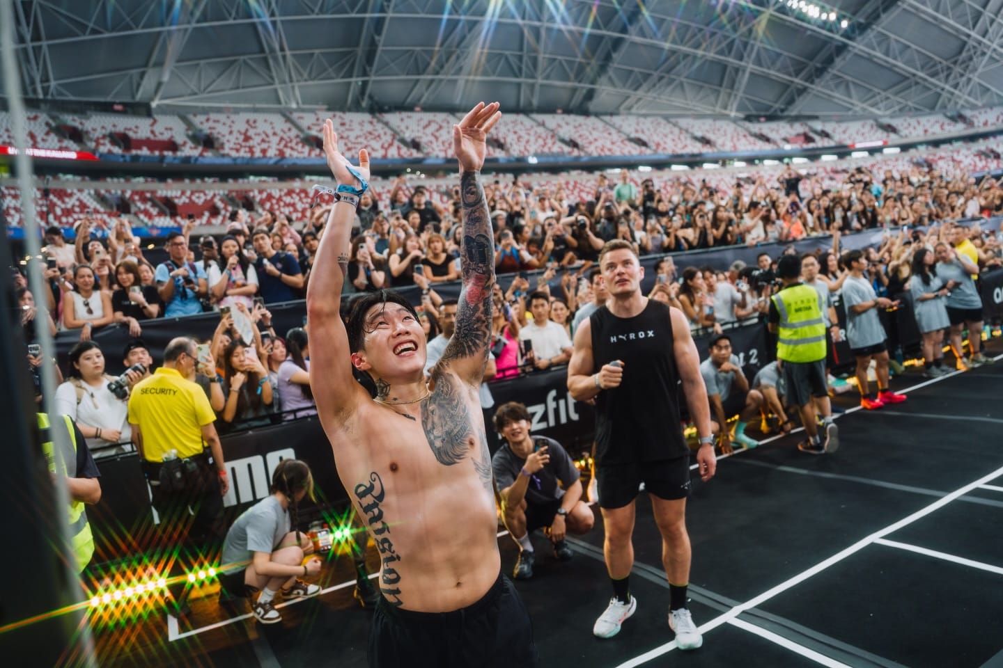 You step into the National Stadium, and for a moment it feels like complete chaos. There’s a horde of grunting people trying to lob weighted balls (the size of a globe) at a target (the size of a fist) about 3m overhead. Then there’s another line of folks speedwalking with clanking kettlebells in each chalked hand. You’ll get lapped by a stampede of bronzed men with abs you could grate garlic on; then shortly after by a pair of sisters in colour-coordinated outfits and ribbons in their braided hair, who look like they’re taking a casual morning jog down a Bali beach; and then perhaps a little later, two grandmas in neon dancercise leggings who are singlehandedly hauling a sled that’s double their bodyweight. And if you’ve come to support a friend, you might feel like you’re in the race yourself, because you’re in the trenches with them, dodging flocks of competitors and a regular spray of sweat. And wait: Was that former minister of state Teo Ser Luck? Oh, that’s definitely Singapore Idol Taufik Batisah. And up on the podium, a more planetary kind of star power: K-pop idol Minho and Netflix reality celeb Hong Beom-seok. Welcome to HYROX, one of Singapore’s latest obsessions, the functional fitness race that’s derived its success from pushing itself as the race for anybody, and any body.