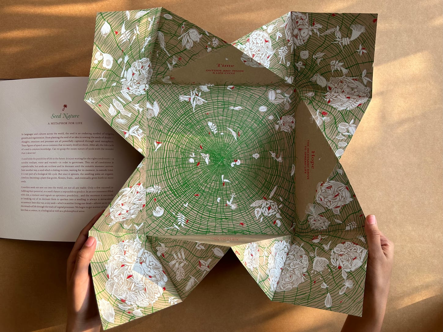 Originally a children’s book publisher in the 1990s, the Chennai-based independent publisher Tara Books brings its highly visual, tactile, and interactive approach to its art books today. Its handcrafted works are produced in its in-house artisan workshop in collaboration with Indian indigenous artists. SEED, for instance, is a beautifully illustrated book that explores humanity’s relationship with seeds, incorporating four distinct book forms—a pop-up, a fold-out, a booklet, and a scroll—to embody each narrative section. Readers are invited to unfold a long accordion scroll that illustrates the journeys of seeds across different landscapes, while a folded pop-up blooms like a seed bursting into life, transforming into a seed-gathering basket similar to those used by the Warli people, an indigenous tribe of western India.
