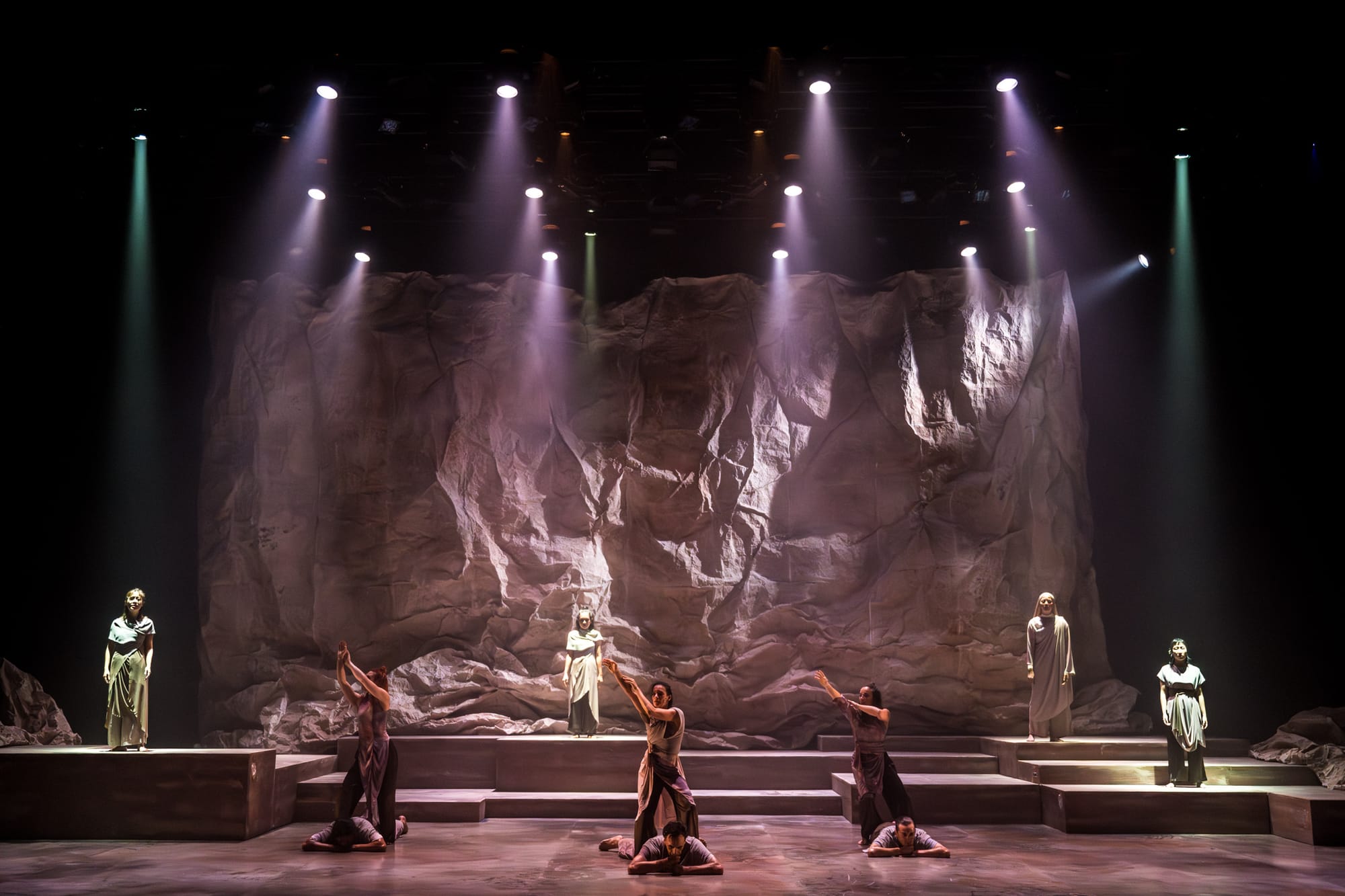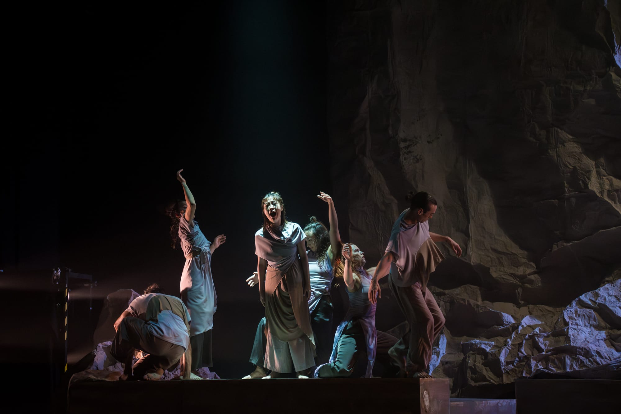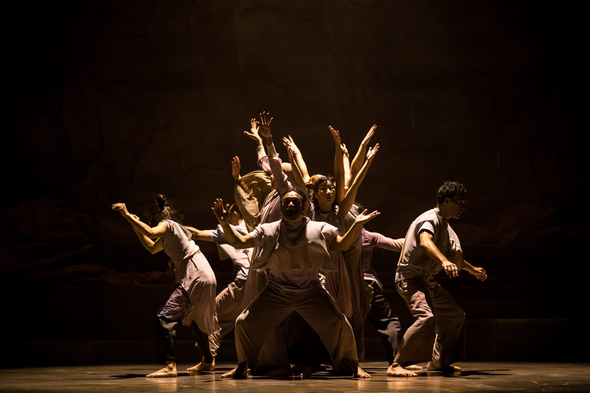 A hush falls over the audience as the theatre’s lights dim and a low, guttural sound rumbles forth from behind closed curtains. This grows into a wave of human voices that crests as the curtains rise. A naked rock face looms over ten bodies that lie in tattered, mud-coloured garments. Their lips do not move; it is as if the rocks themselves are sounding a quiet alarm. This ghostly, tectonic hum recedes into the background as the atmosphere erupts into moans, sobs, chants, the cries of birds and frogs, the creaking of swaying trees—a scene of devastation materialised in sound. The bodies on the floor awaken and advance towards us, as if risen from the dead. They are the earth’s memories of the life it once hosted, reanimated in a post-anthropocenic dream.