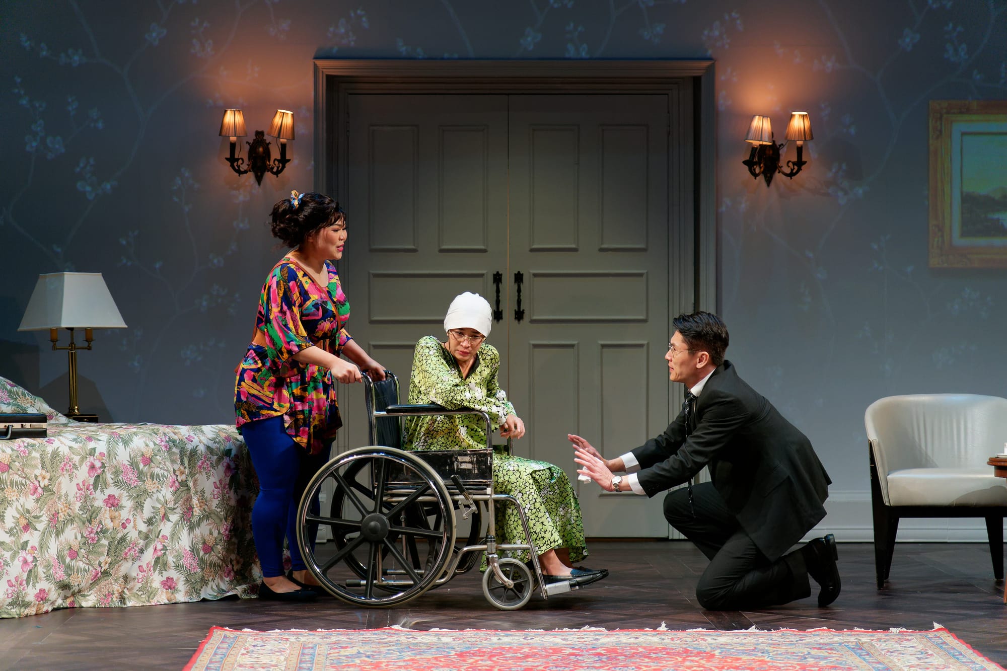 There was a point in this year’s performance where I wondered if I had written all that I had desired to write about this show. The cast members—the majority of whom have been with the show since its inception in 2015—had become so practised and precise in their choreography and embodiment of their characters; I still remember the flubbed lines and uneven accent work of the play’s first incarnation that everyone excused because we could all see the shape of something greater and more astonishing pushing through the seams of each scene. Actors Siti Khalijah Zainal, Jo Kukathas, Ghafir Akbar, Dwayne Lau, Yap Yi Kai, Moo Siew Keh, Pam Oei and Brendon Fernandez all retained their characters over the past eight years; Ivan Heng joined the ensemble in 2016; and Rebecca Ashley Dass, Munah Bagharib, Koji Miyoshi, Oon Shu An and André Jewson were first-timers to the 2023 “Hotel” suite. We got some truly virtuosic turns by performers such as Oei, who had to land the precision of comedic farce as a rich tai-tai possessed by a spirit in one scene—and then transform into a poker-faced, racist matriarch, a foil for the rest of the cast of an interracial wedding channelling the slapstick chaos of an “Under One Roof” episode. Then there’s Ghafir, turning on the charisma as musical genius P Ramlee in one scene, and the pathos of a well-heeled businessman subject to racial profiling and police brutality in another.