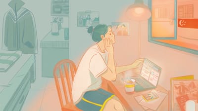 Our longtime collaborator, Ngiam Li Yi, brings her gentle palette back for this story on the precariousness of life as a Chinese scholar in Singapore. The header illustration details everyday elements in a typical rented bedroom, offering us an intimate view of a transient life here, both comforting and mundane. Her dreamlike spot brings together elements of both the Singaporean and Chinese flag, as the students steady themselves, staring at an uncertain future tinged with hope.